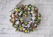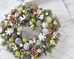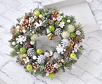 白い松かさをベースにした しっかりしたつくりのリースです