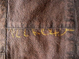 生地の一部に、生地の製造工程で書き込まれた文字のようなものが消えずに残っています。こういうのも面白いかと思い、わざわざ使ってみました。画像の最後とその前をご確認ください。