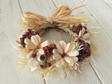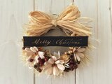 ラフィアのリボンをアクセントに、ティーツリーやハンドメイドフラワーのプチフラワー、野薔薇の実などで制作した小さめのクリスマスリースです。