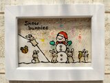 光が当たると、色合いやデザインが優しく反射し、見るたびに新たな楽しみをお届けします。サイズは縦約12cm・横約16cm程度で、ガラス絵の具を使用した薄いアクリルにウサギと雪だるまが描かれています^^