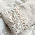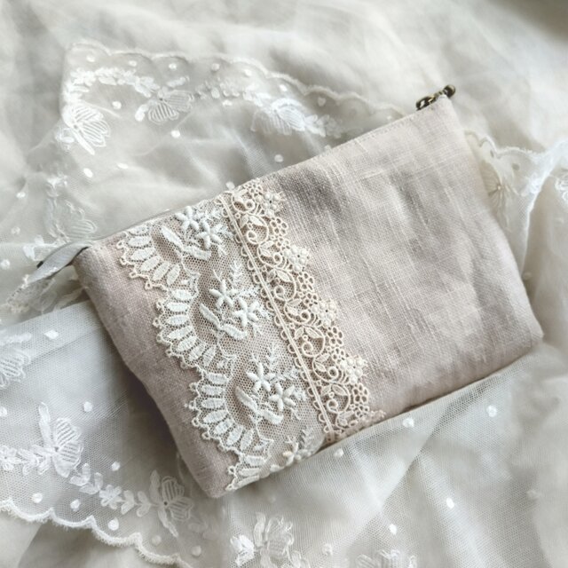 エクリュ(淡いベージュ)リネンにアンティークレーと現行レースをのせたポーチです。