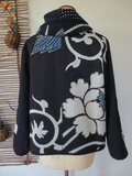 表裏、どちらも主役のリバーシブルミニフードジャケットです。古布の筒描きの図柄に沿って草木染の糸で刺し子をほどこした表面。