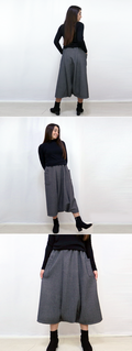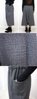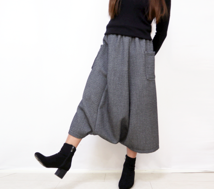 中央部分を袋状して左右から足が出るデザインです。パンツの機能性とスカートの優雅さを楽しめる素敵なデザインです。両サイドに可愛らしいポケットも付けました。全体は3つのパートで出来ていて、極力切替や縫い目を少なくして素材のドレープ感を出すよう工夫しました。