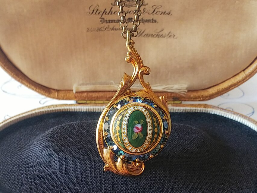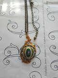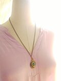シックなBlue、深いGreenの中に1輪の可憐な赤い薔薇、古めかしく美しい佇まいのネックレスです。