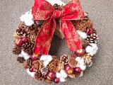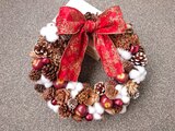 ふわふわのコットンとりんごと木の実がぎゅっと詰まったとても可愛い雰囲気のリースです。木の実の愛らしい形やコットンとりんごからなるホンワカした感じに自然と笑顔になってしまいそうです。クリスマスらしい華やかなリボンもまた魅力のひとつになっています。