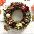 プリザーブドの深紅のバラと赤いリンゴ・ヒイラギの赤い実など深紅のカラーが目を惹くクリスマスリースです。