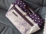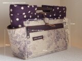 色数を押さえて紫の濃淡で描かれたバラ柄と濃い紫の水玉の組み合わせはシックでクラシック風な優しい雰囲気に仕上がりました。共布のくるみボタンやサイドポケットのレース使いで個性を出しました。お散歩バッグとしても持って歩きたくなるバッグです。