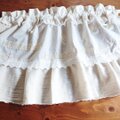 ♥️アンティーク風のナチュラルコットン生地(生成り)に、いろいろなトーションレースを1つ1つ丁寧に縫い付け、薔薇のコットンレース、サテンリボンをあしらった、一点物のカフェカーテンを制作しました。