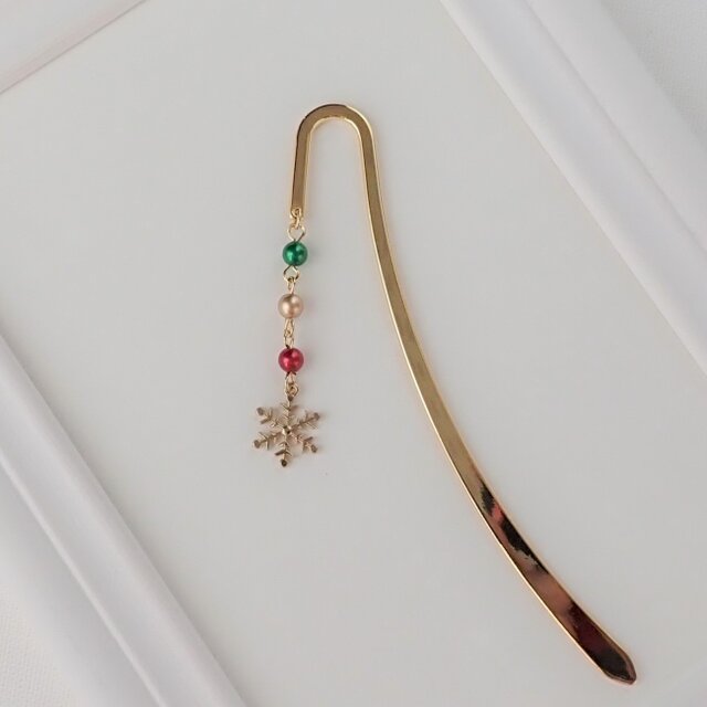 雪のチャームとクリスマスカラーのパールが揺れる可愛いブックマーカーです。