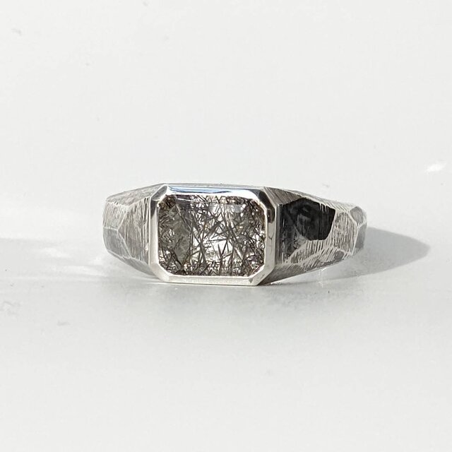 BKルチル トルマリン イン クォーツ オクタゴンカット 印台 いぶし シルバーSV925リング