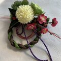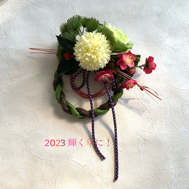 直径約14cmのグリーン・ブラウンの個性的なしめ縄ベースに花材を用いて作ってあります。