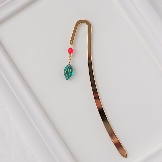 クリスマスカラーの葉っぱビーズとチェコビーズの可愛いブックマーカーです。