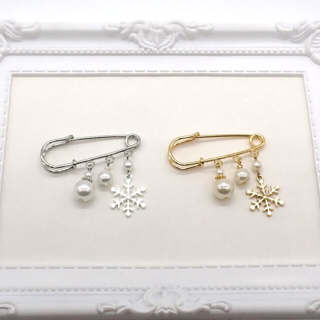 雪のチャームとパールが揺れる上品な雰囲気のブローチです。