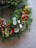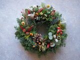 フレッシュな針葉樹とヤドリギを使用しております。少しずつドライとなって落ち着いた色味へと変化し、クリスマスを過ぎてもお楽しみ頂けます。
