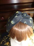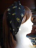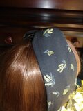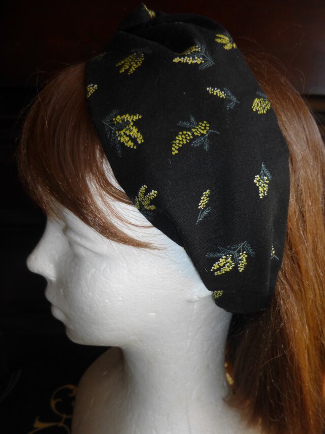 黒地のミモザ柄の中厚ブロード地のクロスヘアバンドです。小さな花柄で黒地なのでどんな服にも合わせやすいと思います。