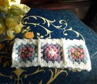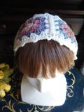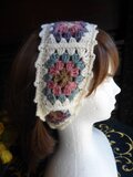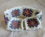 白ベースのモチーフを6枚つなげたクラシカルなヘアバンドです。糸は細めの並太糸です。