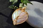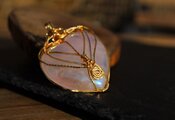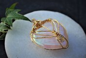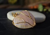 ローズオーラクォーツの大きなハートを、ゴールドのワイヤーで巻きました。