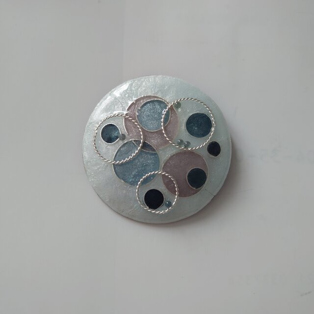 落ち着いたピンク色に夜空のような紺色と、2色が混ざった淡い紫色というニュアンスのある色合いが綺麗です。表面の細かい銀色も光り過ぎず上品ですね。個人的には星雲のような印象を受けました。素敵な作品をありがとうございます:)