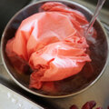 サボテンに生息するエンジムシが作り出す赤い色素で、南米ペルーが主な産地です。紀元前から用いられてきた動物染料であり、日本では明治時代以降から染められてきました。ムシと聞くと驚きますが、とても美しい赤い染料です。媒染剤によって全く異なる色に変化します。今回はアルミ媒染で鮮やかなピンクに染めました。