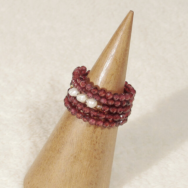本真珠(淡水パール、ナチュラルカラー、ホワイト)と、きらきらと細かに輝く多面カットのロードライトガーネットの5連リングです。