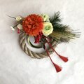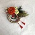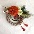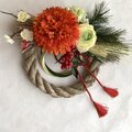 朱色の大輪の重ね菊が目を惹く和風のお正月飾りです。