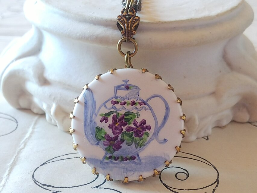 ポットの中に紫色のハーブが入っているとても可愛らしい陶磁器製のボタンでお作り致しました。