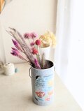 畑で自家栽培しているケイトウやセンニチコウ、グラスなどのドライフラワーと、レトロ風にアレンジしたリメイク缶です☆