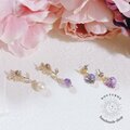 リーフパーツにコットンパールとラフカットのアメジストを下げたアシンメトリーのピアス