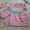 アイルランドで紡がれる伝統的な毛糸を使い、胸元に編み込み模様を入れたセーターを編んでいます。