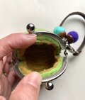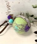 手のひらサイズの球体の羊毛フエルトがま口で、バックの外付けができるタイプです。