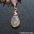 ワイヤーに中央にプレシャスオパール、グリーンカラーのジルコン、へマタイト、イエローカラーのジルコン、シトリンを下げ、チェーンに繋ぎました。