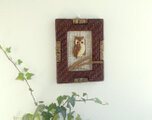 珍しい編みかご式の額縁が手に入ったので、そのイメージを大切にフクロウを彫り上げました。止まり木は野ツバキの枝木です。風流な仕上がりをお楽しみください。