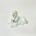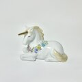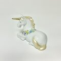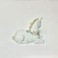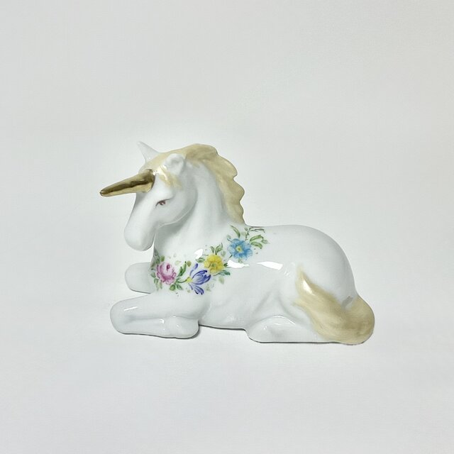 形の美しい白磁のユニコーンは、金の角と持ち、バラのリースをかけています。