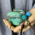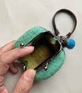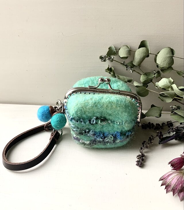 手のひらサイズの球体の羊毛フエルトがま口で、バックの外付けができるタイプです。