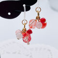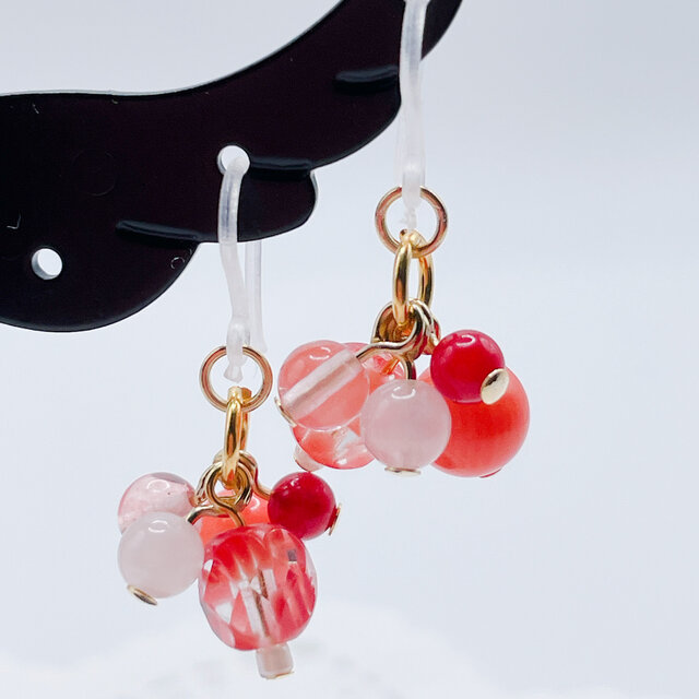 赤いラインの入ったガラスビーズに、ピンクと赤のコーラル(珊瑚)、ローズクォーツ、ストロベリークォーツを合わせたピアスです。