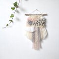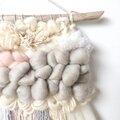 みるく色のふわふわの羊毛とピンク、グレーなどの柔らかなお色を組み合せ、ふわもこ可愛らしいタペストリーに仕上げました。