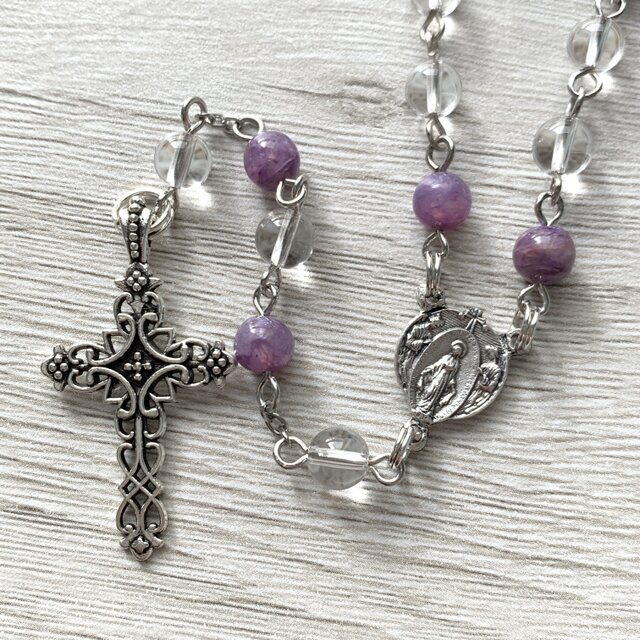 このエンジェルシリカをポイントに2種の本水晶でつなげたロザリオです。