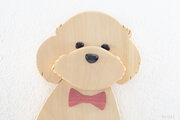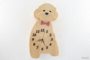 柔らかい印象の温かみを感じられるクリーム色の木肌が特徴的な銀杏(イチョウ)を、正面を向いて座っているトイプードルの形に切り出した大きな掛け時計です。