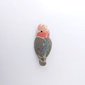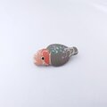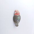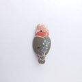 見返りポーズのモモイロインコをモチーフにした塗りのブローチ。
