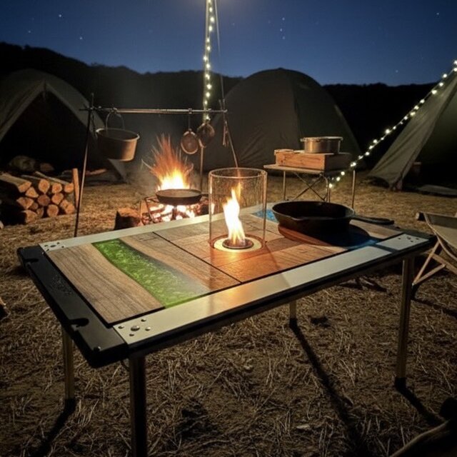 YURAGI(ゆらぎ)は、Snow PeakのIGT(アイアングリルテーブル)システムにぴったり収まる1ユニットサイズのバイオエタノール暖炉です。