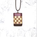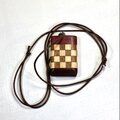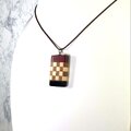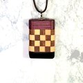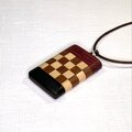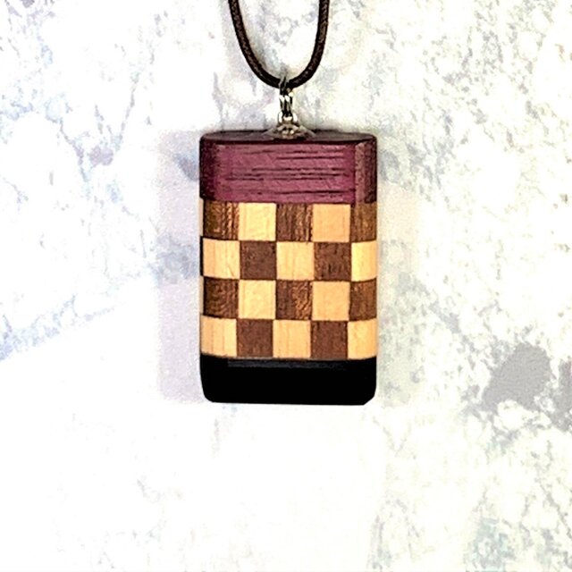 濃い目の茶色のマホガニーと白っぽい桧の材料を用いて市松模様状に寄木にしました。上部にパープルハート、下部にアフリカン・ブラックウッドの木を配置して市松模様を挟むように貼り合わせました。パープルハートの赤紫色もアフリカン・ブラックウッドの黒色も大変鮮やかですが、いずれも天然の色です。