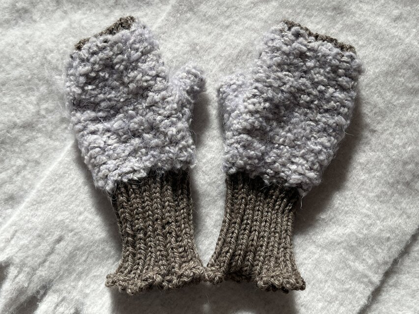 薄紫のファーは、ファーのモコモコがたっぷり出るように裏メリヤス編み。