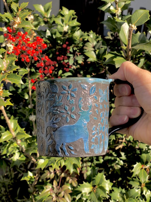 黒い土に青い化粧を塗り重ねて、掻き落としという手法で、版画の盤のように柄を残して彫りました。
