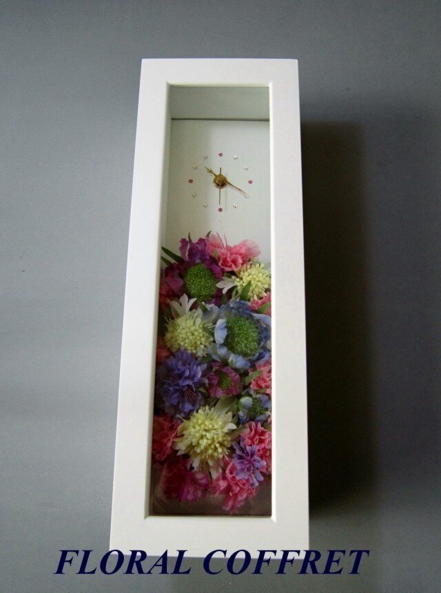 木製の時計のついたボックスの中に、色々な種類のスカビオサをアレンジしました。