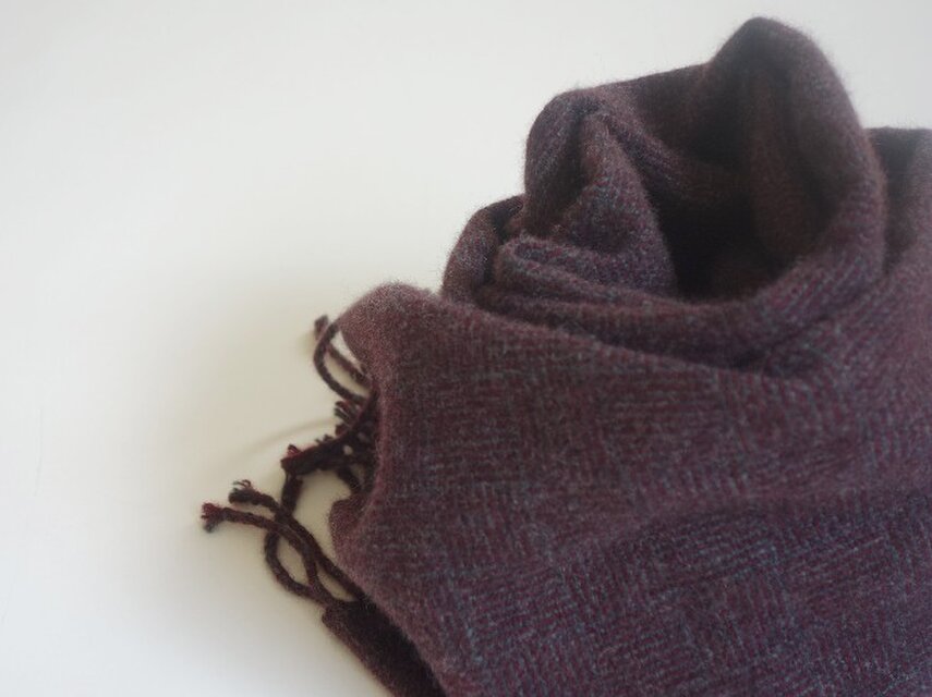 手織りカシミアマフラー・・えんじとチャコールのあじろ
