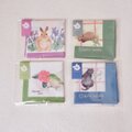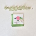 メジロの羽の色に合わせるように抹茶色の縁にサザンカとメジロが戯れている様子を水彩画で表現しました。5種類の絵柄がランダムに配置されています。