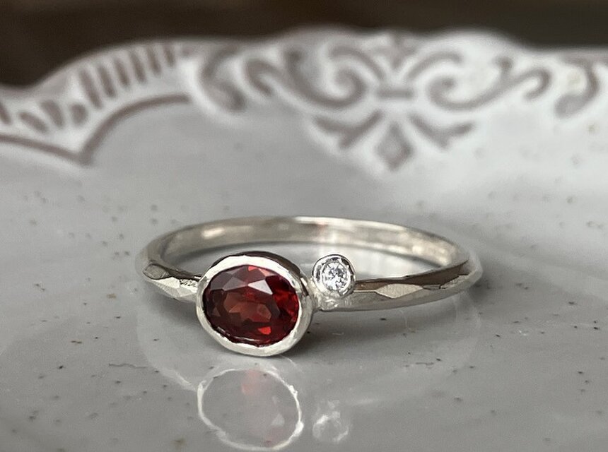 その控えめな輝きが愛らしい赤いガーネットに、キラっと小さなダイヤモンドを添えて。