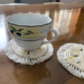 アクリルコードを結んで作ったマクラメのコースター(白×黄色とモスグリーン)です。
