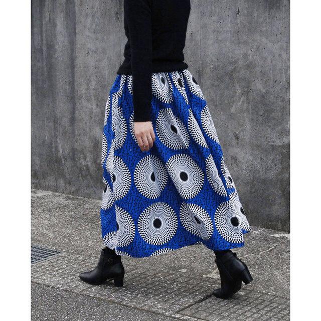 アフリカンプリントを使って制作した、ボリューム感のあるロングスカートです。