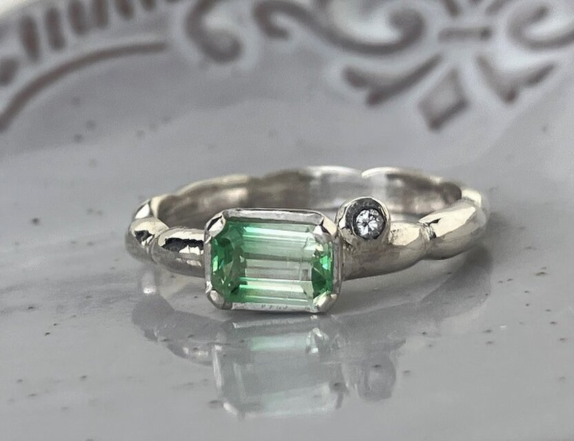 今回は、鮮やかな緑色がみずみずしく、透明な部分とのバイカラーがいっそう爽やかな印象のグリーンガーネットです。